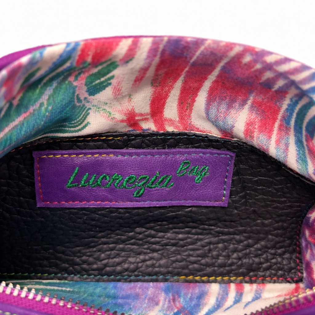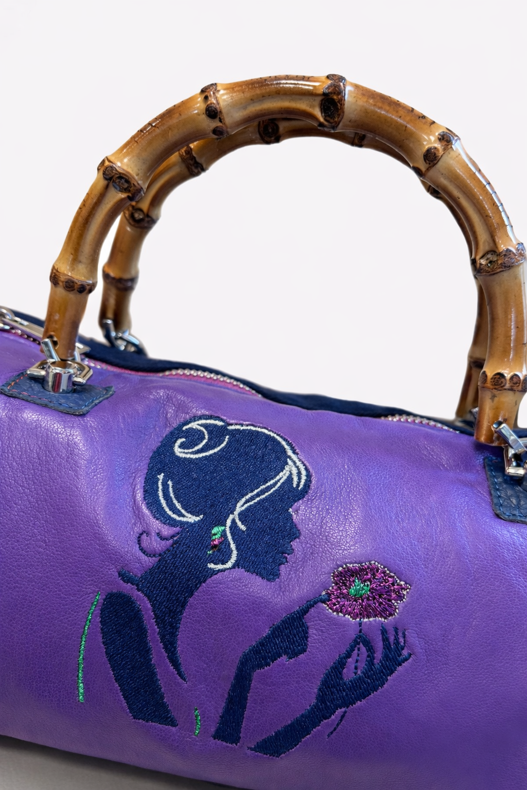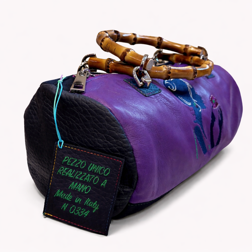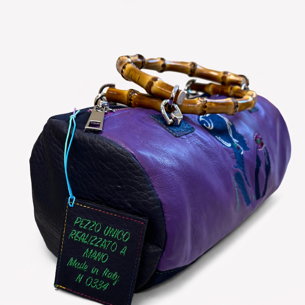 Realizzato in nappa pieno fiore viola, morbida e avvolgente al tatto, si combina con pelle martellata blu e jeans, creando un mix contemporaneo e sofisticato. L’unione di texture differenti esalta l’artigianalità e rende il modello unico nel suo genere.