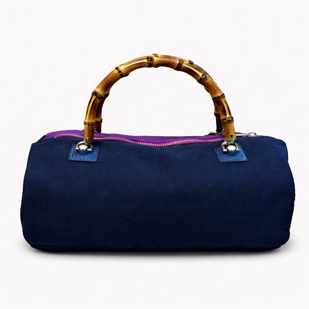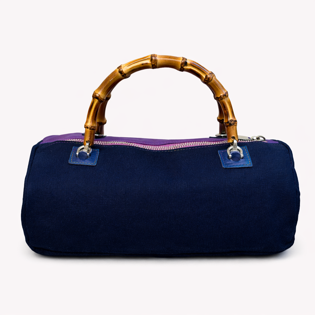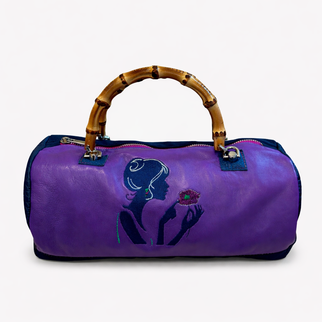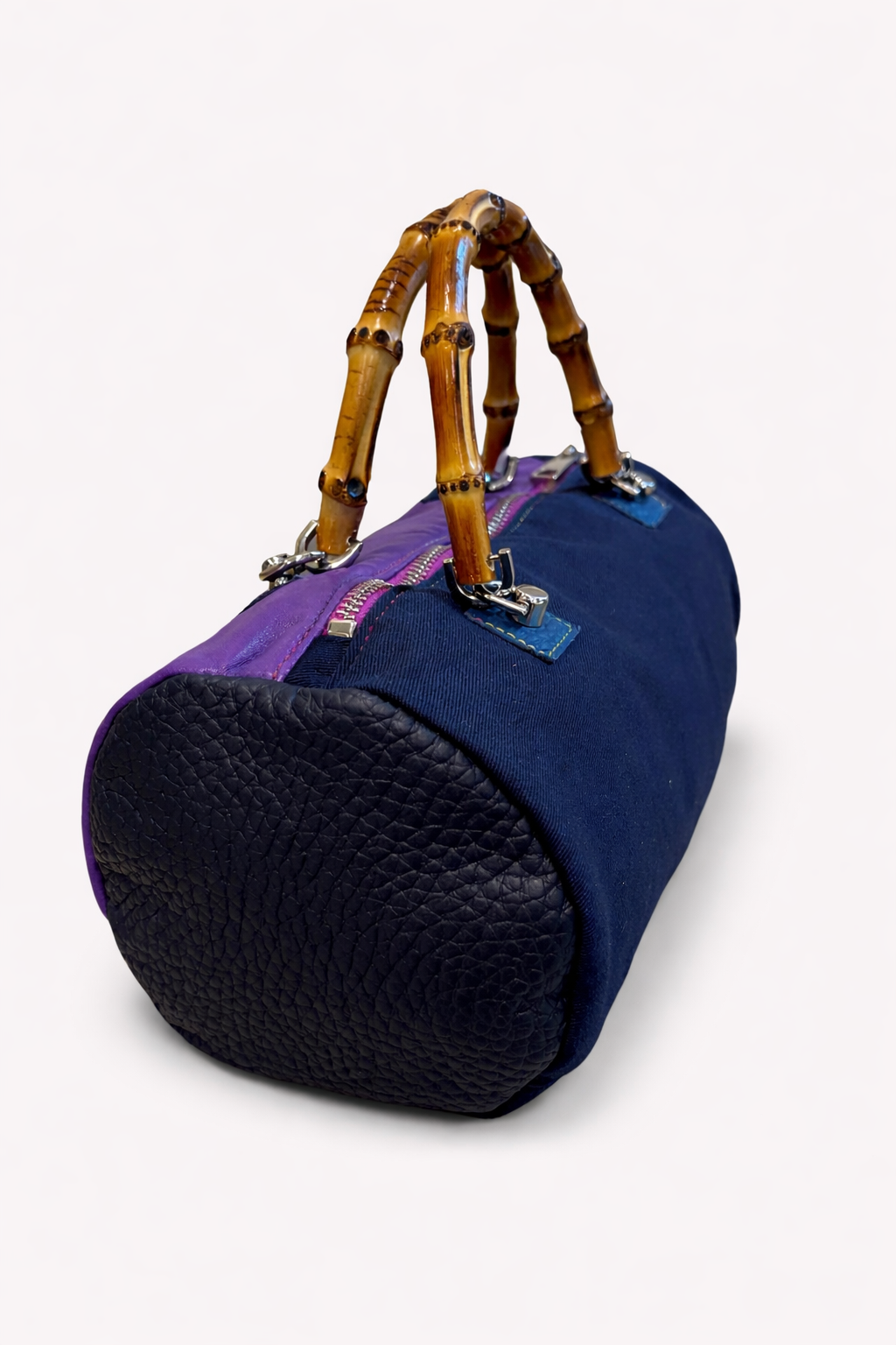 Realizzato in nappa pieno fiore viola, morbida e avvolgente al tatto, si combina con pelle martellata blu e jeans, creando un mix contemporaneo e sofisticato. L’unione di texture differenti esalta l’artigianalità e rende il modello unico nel suo genere.