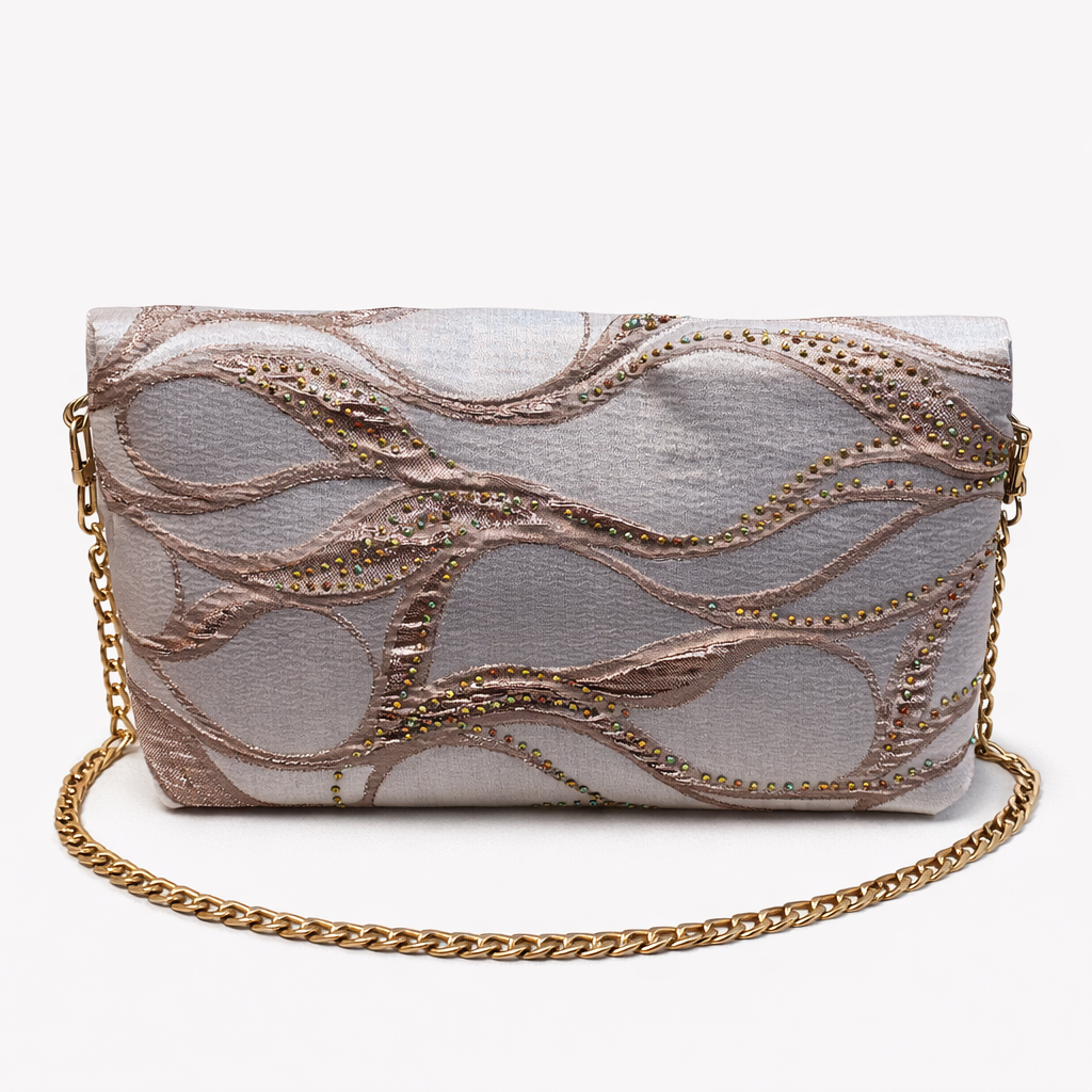 Realizzata in prezioso tessuto broccato orientale con fantasia geometrica nei toni del rame e oro su fondo avorio, cattura lo sguardo grazie ai suoi contrasti caldi e sofisticati. Gli strass applicati donano ulteriore luminosità, esaltando l’eleganza del disegno geometrico.