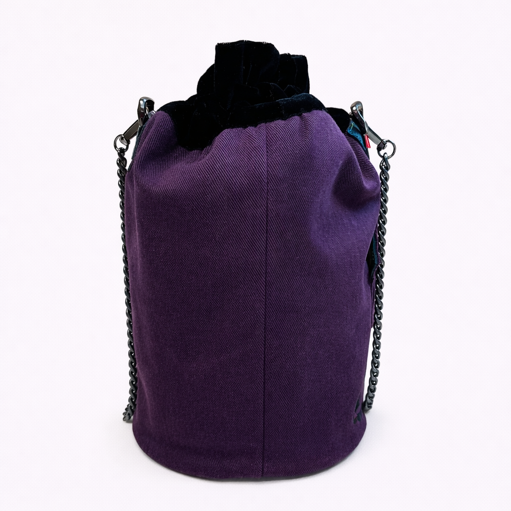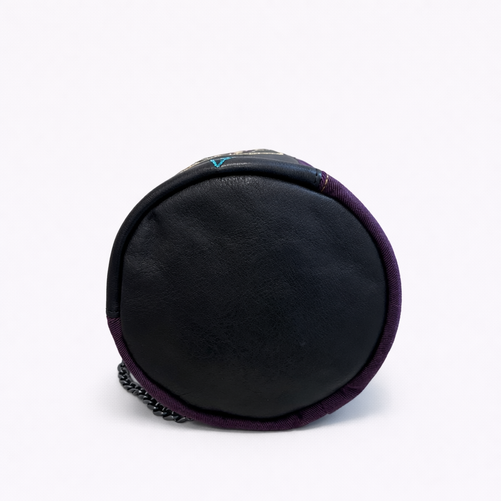 Realizzato in pelle nera abbinata a jeans viola scuro, crea un contrasto raffinato e originale, capace di valorizzare ogni outfit con personalità.
