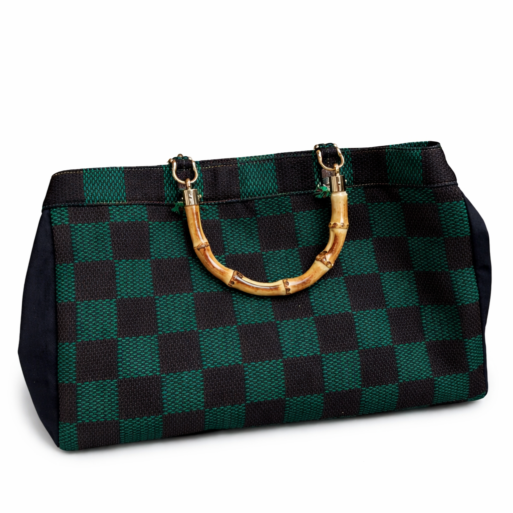 Realizzata in pelle martellata marrone scuro, intensa e avvolgente, è arricchita da un mix ricercato di tessuto di pregio con fantasia a quadri e jeans nero, che donano profondità e carattere al design.