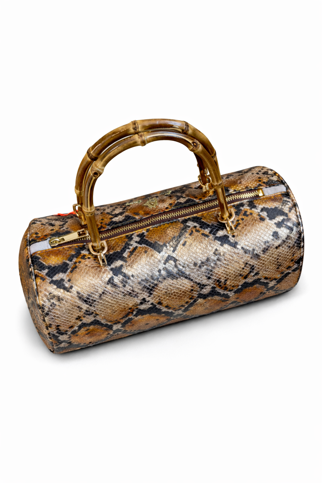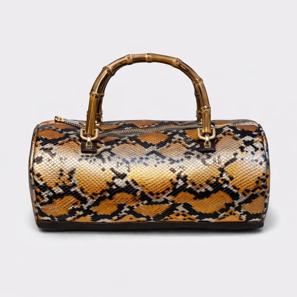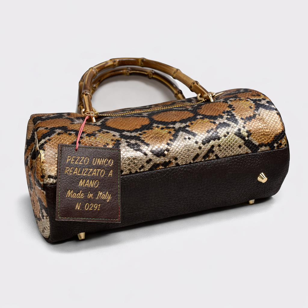 Realizzato in pelle stampa pitone nelle calde tonalità del marrone, oro e nero, presenta una finitura luminosa e materica che valorizza il disegno naturale della texture, rendendo ogni dettaglio unico e irripetibile.
