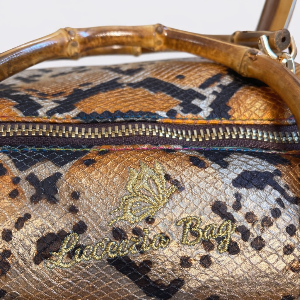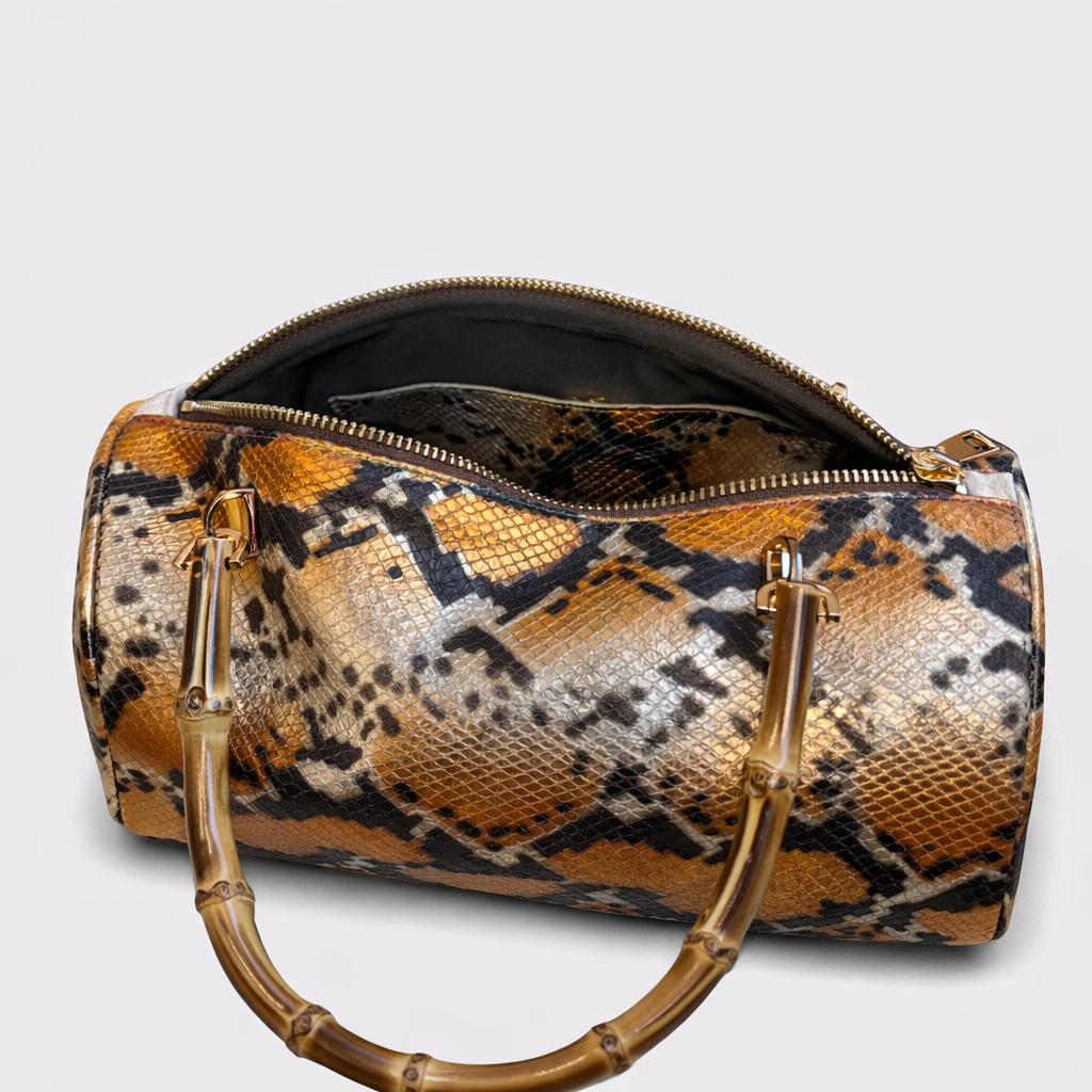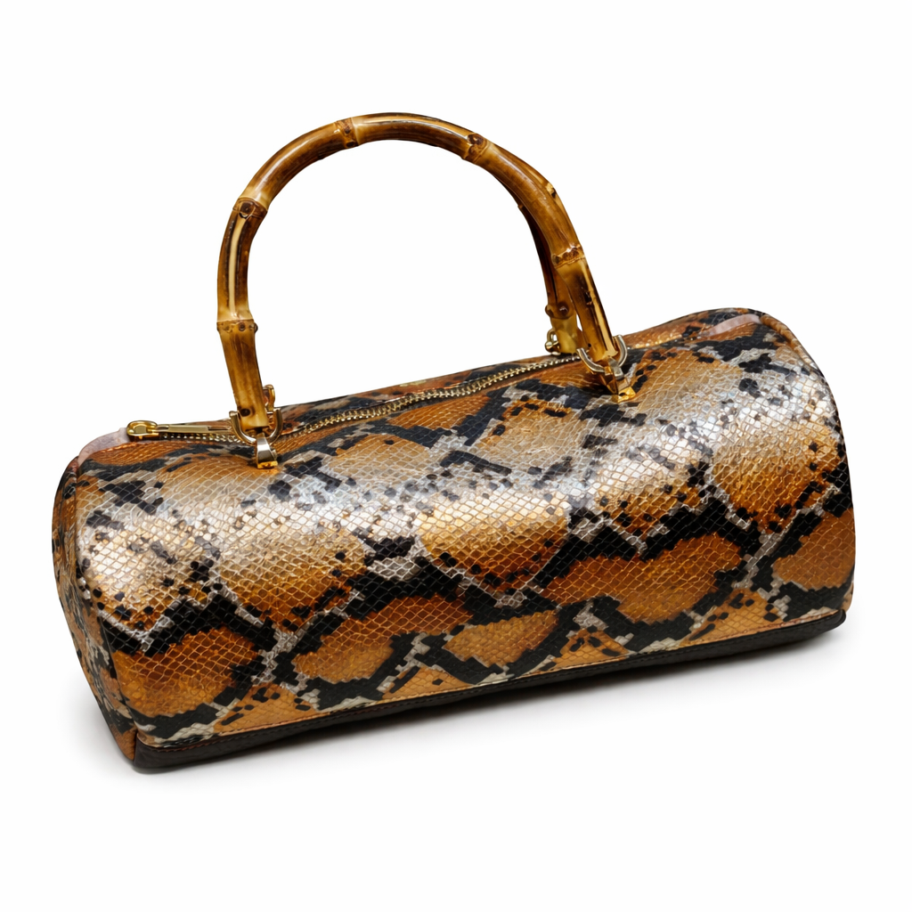Realizzato in pelle stampa pitone nelle calde tonalità del marrone, oro e nero, presenta una finitura luminosa e materica che valorizza il disegno naturale della texture, rendendo ogni dettaglio unico e irripetibile.